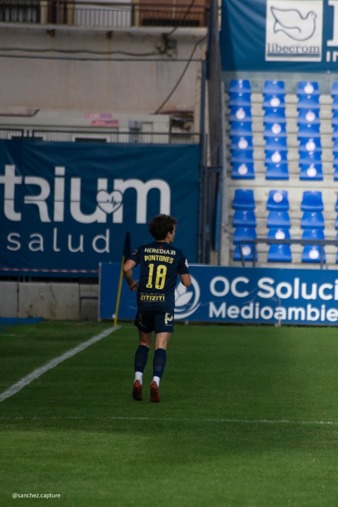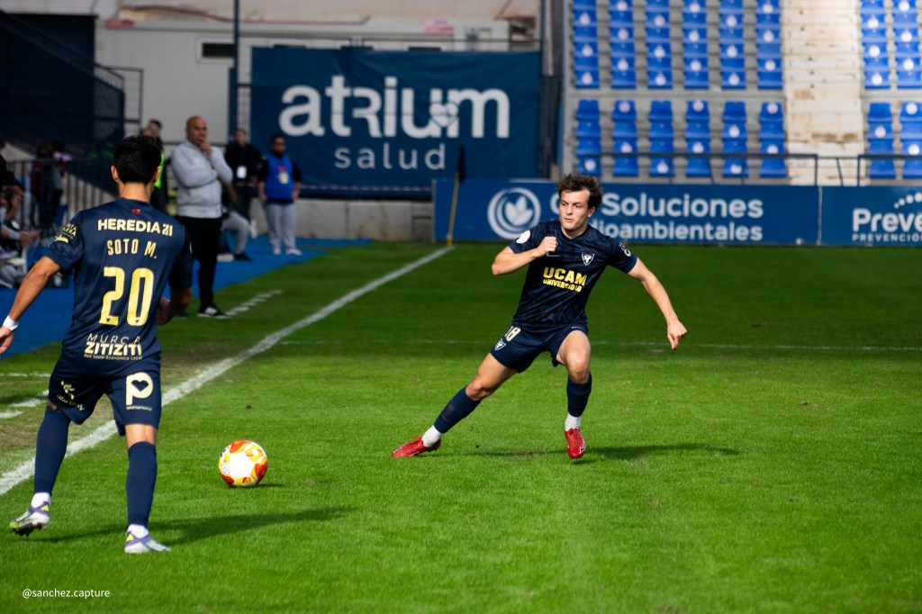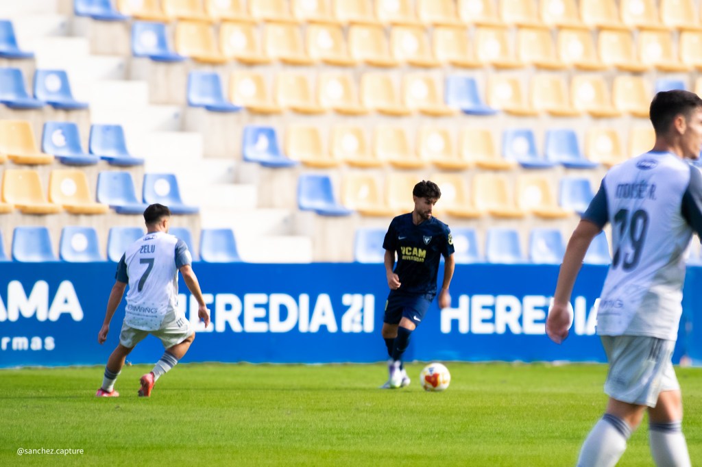 El UCAM Murcia Club de Fútbol no bajó la intensidad y continuó imponiendo su juego con firmeza. Fruto de esa insistencia, diez minutos antes del descanso llegó la recompensa. Pontones firmó una acción sensacional por banda, ganó hasta tres duelos, llegó al área rival y conectó un pase sensaciones con Javi Ramírez, que mandó al fondo de la red para establecer el 1-0 y cerrar una primera mitad de este encuentro liguero en el actual Estadio Heredia 21 La Condomina.